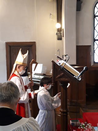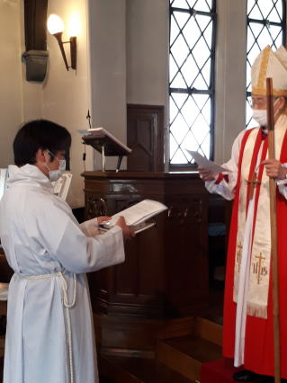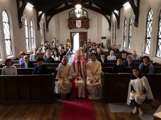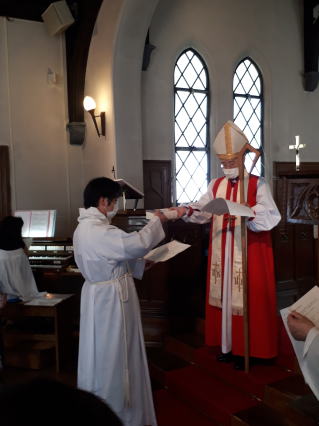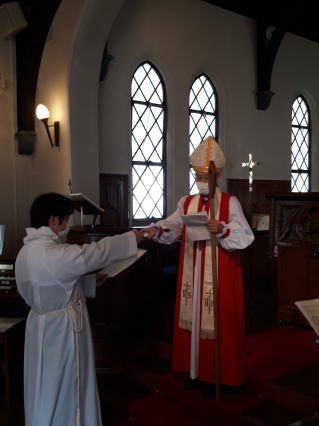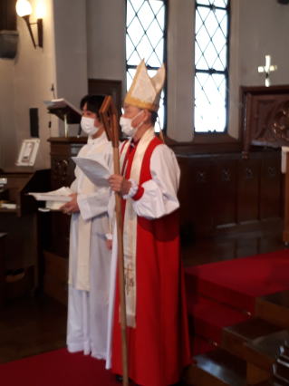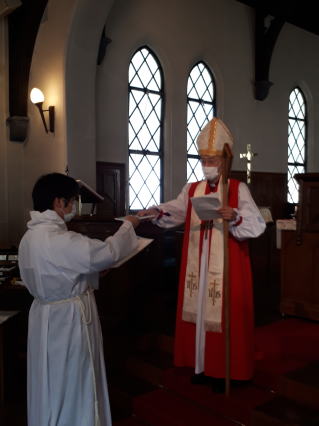 1908年5月10日に宣教が開始されて今年宣教113年を迎えた盛岡聖公会ですが、去る5月9日(復活節第6主日)にヨハネ吉田雅人主教が巡回され記念の祈りを献げました。礼拝の冒頭で、今年4月1日より盛岡聖公会に着任したステパノ越山哲也司祭の牧師任命式が厳かな雰囲気の中、コロナ感染予防対策をしたうえで行われました。