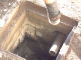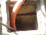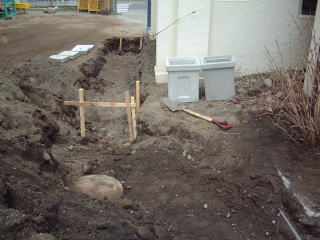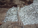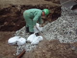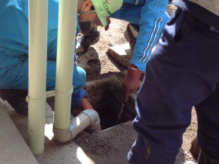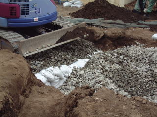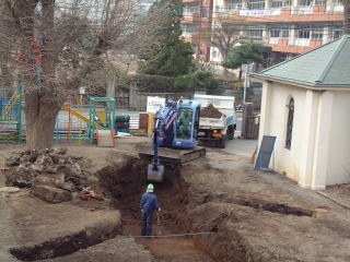 既設の水道管の上下に砂袋を置いてパイプ保護をしながらの作業です |
